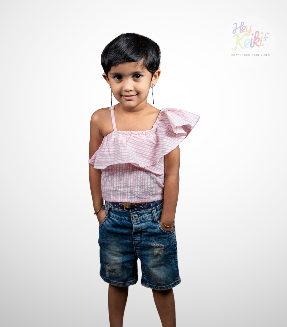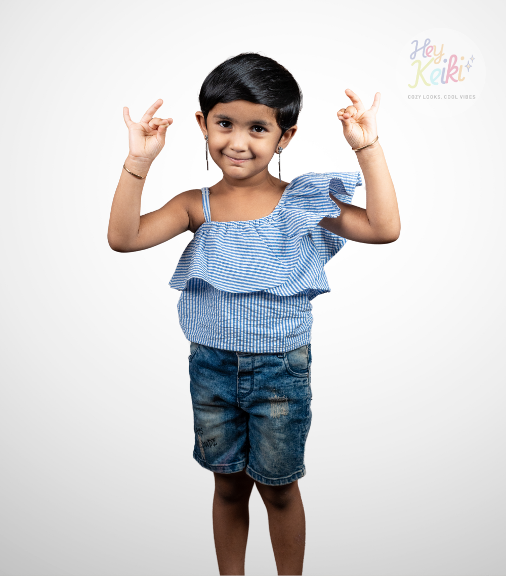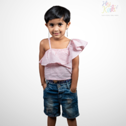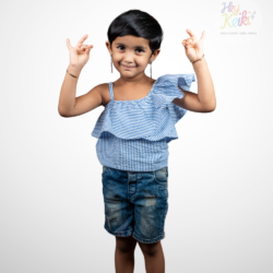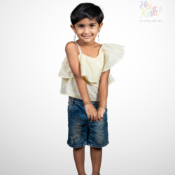 Designed with elegant detailing and a modern silhouette, this top pairs perfectly with jeans, shorts, or skirts. The lightweight fabric ensures easy movement, while the gentle cotton feel keeps kids comfortable on sensitive skin.